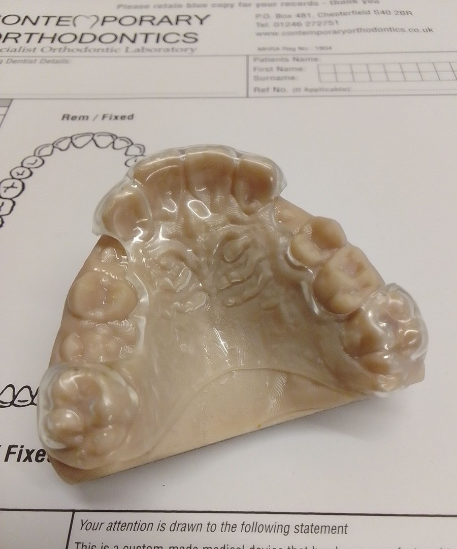 The 'Theroux Retainer' is a pressure-formed appliance, used as a space maintainer/retainer. It's particularly useful for when molars have short crown height making retention difficult with metal clasps